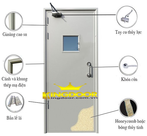 – Những phụ kiện kèm theo: Ổ khóa, tay co thủy lực, thanh thoát hiểm, kính chống cháy,…