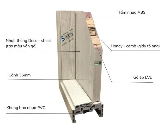 • Các lớp bên trong gồm ABS chống cháy, chịu nhiệt, PVC gỗ, LVL chịu lực, lõi Honeycomb cách âm cách nhiệt.